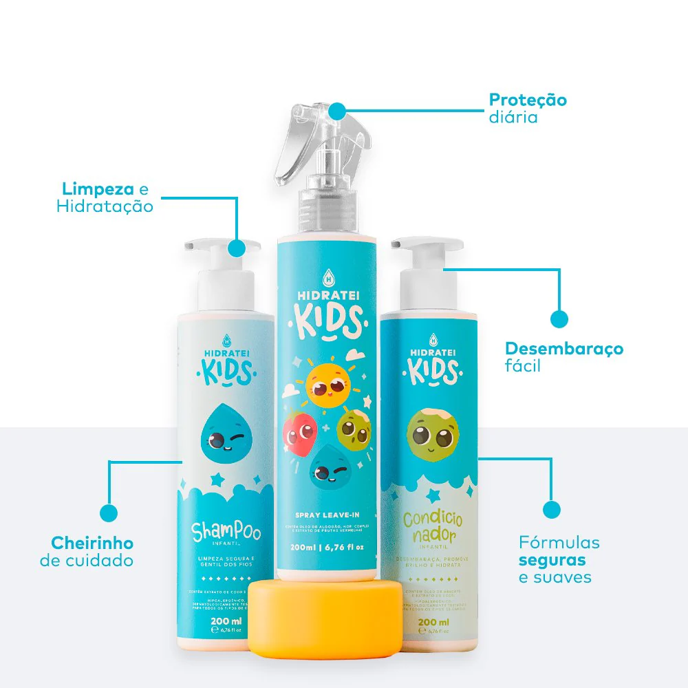 O Kit Hidratei Kids oferece uma rotina completa de cuidados capilares, com shampoo, condicionador e spray, garantindo cabelos limpos, macios e cheirosos. 🌸✨